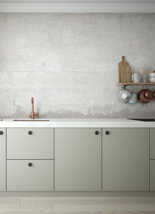 The patina on the wall steals the show in this kitchen with just the bare essentials.  The copper tap and saucepans bring an element of warmth into the otherwise cool space, and the dark cupboard handles add contrast.