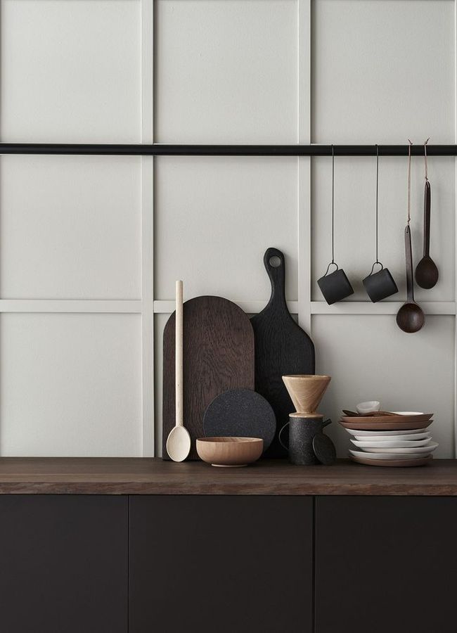 This kitchen also has no upper units, keeping the feel minimalistic.  Here they have installed a simple pipe with s hooks, to hang a selection of everyday kitchen utensils; creating both a functional and aesthetically pleasing backdrop.